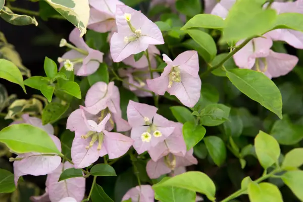 Bougainvillea 「雪の紫」 bears clusters of tiny white flowers surrounded by delicate pink-purple bracts.