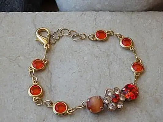 - シャネルのシグネチャージュエリールックのもう1つは、オープンフラワーのつぼみなど、カラフルな宝石をモチーフにしたゴールドのチェーンブレスレットです。これらは、オレンジ色の石が付いたこの24カラットの金メッキの模造品バージョン(以下に表示)など、Etsyショップで見つけることができます。このスタイルは約99ドルで、カラーパレットに関係なく、あらゆる衣装を明るくします。
