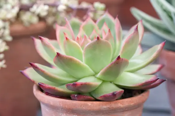 Echeveria agavoides 魅力的な多肉植物であり、赤い縁のある淡い緑の三角形の肉質の常緑の葉のロゼットを形成しています。春と初夏には、黄色の先端がある赤いランタン型の花が背の高い茎に表示されます。