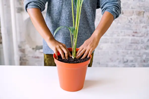ケンティアの手のひらを土壌ベースの堆肥の混合物に植え付け、園芸のグリットや砂を加えて、排水穴のある鍋に植えます。