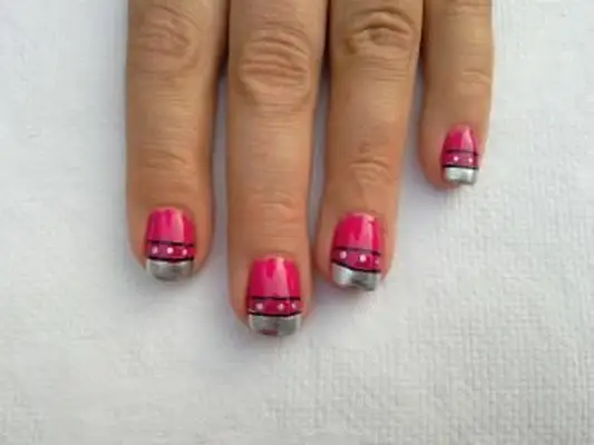 - ほうれい線(ピンクとシルバーのポリッシュが出会う場所)に黒のストライピングテープを貼ります。ピンクの爪の真ん中あたりに2番目のストライプを適用します。