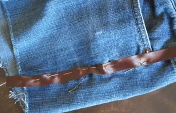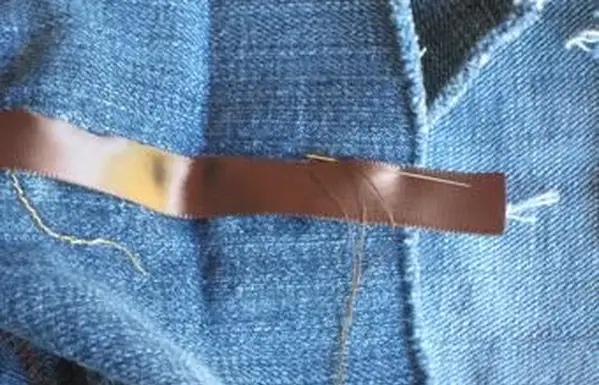 - 一本の長さの糸で針に糸を通し、端を結びます。ショーツの中から始めて、ウエストバンドの近くで、デニムにリボンを縫い始めます。スリップステッチを使用して、手縫いステッチ生地の表側に小さなステッチだけを取り、長いステッチを内側または縫い目に隠します。袖口に着いたら、数針縫ってリボンを折りたたんだ位置に固定し、反対側を上に続けます。他のリボンで繰り返します。