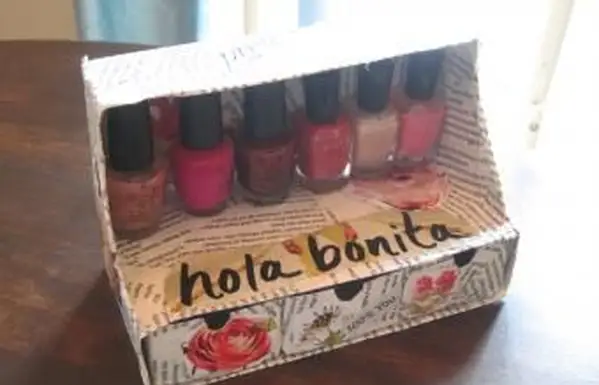 - ドリンクボックスの側面と上部をカットして、マニキュアのディスプレイに少しスタイルを与えます。好きなデザインを選ぶことができますが、コレクションをよりよく見せるために、棚をもう少し露出させると便利です。