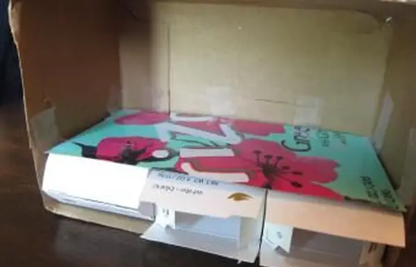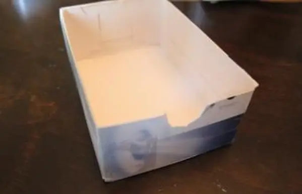 - ドリンクボックスの幅である段ボールの長方形に4インチの印を付けます。これを切り取り、箱の端の内側にテープで留めて棚を作ります。棚の高さは約1インチ半、または石鹸箱を入れるときにカバーするのに十分な高さである必要があります。
