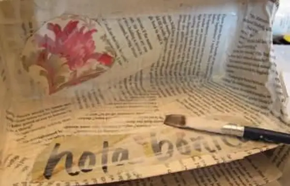 - ディスプレイの内側全体にデコパージュ媒体を刷毛で塗ります。棚がユニットの残りの部分と出会う領域に特に注意して、本のページの断片を媒体に押し込み始めます。あなたはそれを強化するのを助けるためにここで何層もの紙を使いたいでしょう。本の各ページの後に、さらにデコパージュ媒体を適用します。ユニット全体が紙で覆われるまで続けます。